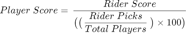 The top 30 finishers of a race earn points. User scores are calculated by dividing the number of points a rider earned by the percentage of the users who picked them.